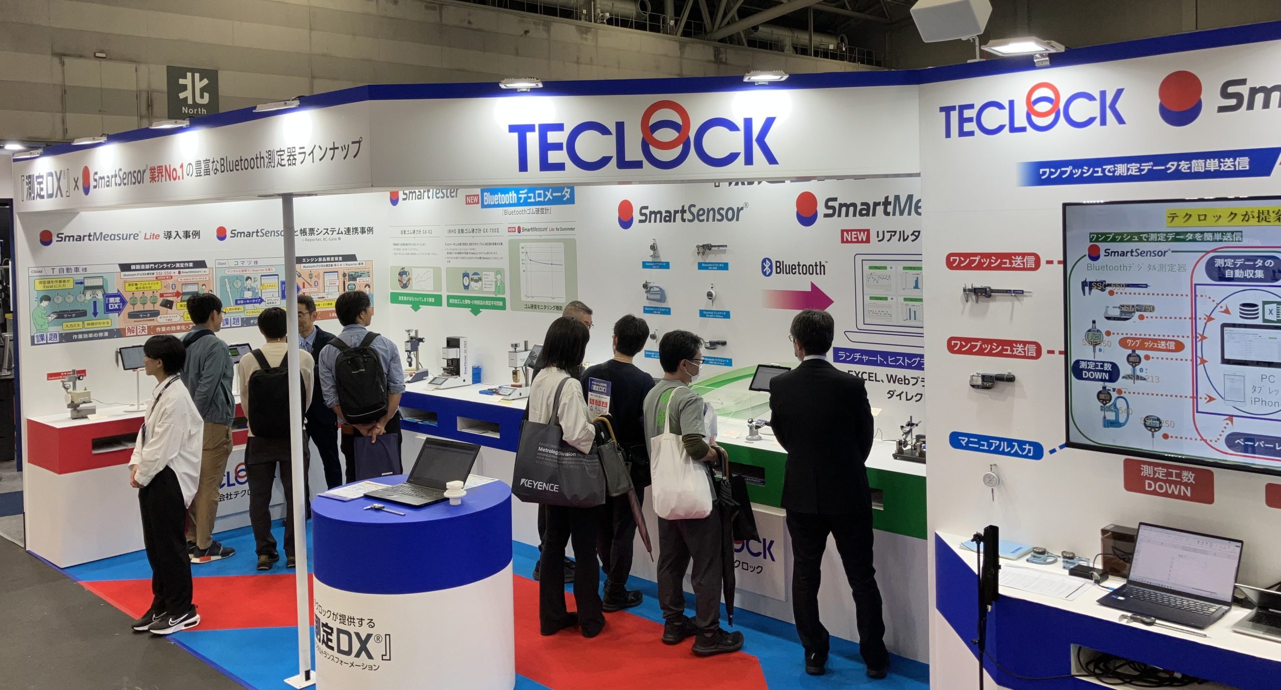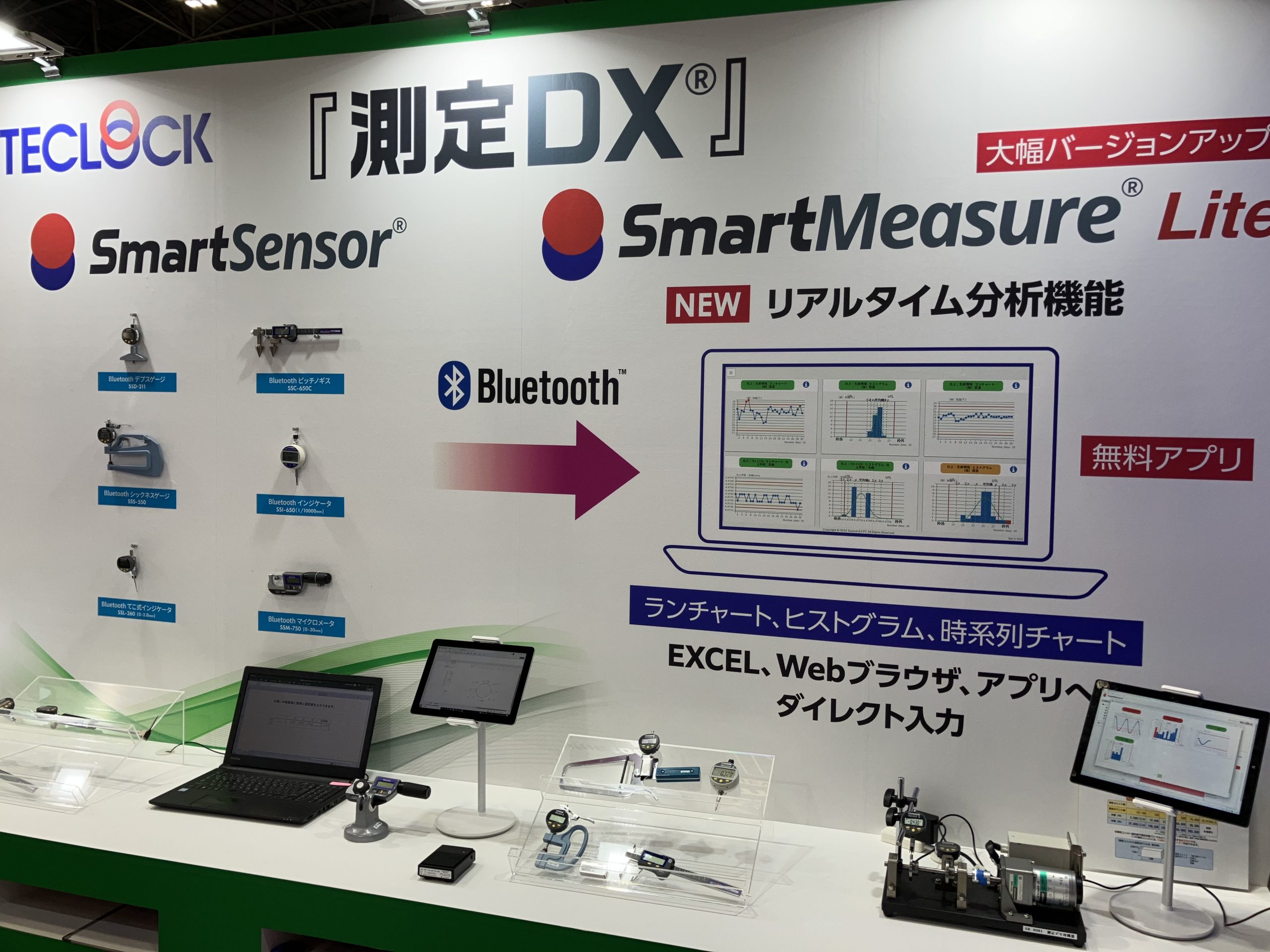 ブースでは、『測定DX®』関連製品の展示に加え、定期的に実演モンストレーションを実施。Bluetooth®機能を搭載した「Bluetoothデジタル測定器」と、テクロック独自開発の測定データ管理システム「SmartMeasure®シリーズ」(特許11件取得済み)を活用した測定の様子をご紹介しました。
